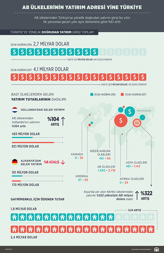 Avrupa Birliği (AB) AB ülkelerinden Türkiye'ye yönelik uluslararası doğrudan yatırım girişi bu yılın ilk yarısında geçen yılın aynı dönemine göre yüzde 61 artışla 1,7 milyar dolardan 2,7 milyar dolara çıktı.