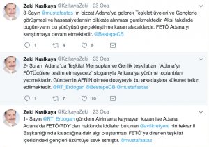 2- Şu an Adana'da Teşkilat Mensupları ve Genlik teşkilatları 'Adana'yı FÖTÜcülere teslim etmeyeceğiz' sloganıyla Ankara'ya yürüme toplantıları yapmaktadır. Gündemin AFRİN olması dolayısıyla bu arkadaşlara sükunet telkin edilmektedir. @RT_Erdogan @BestepeCB @mustafaatas