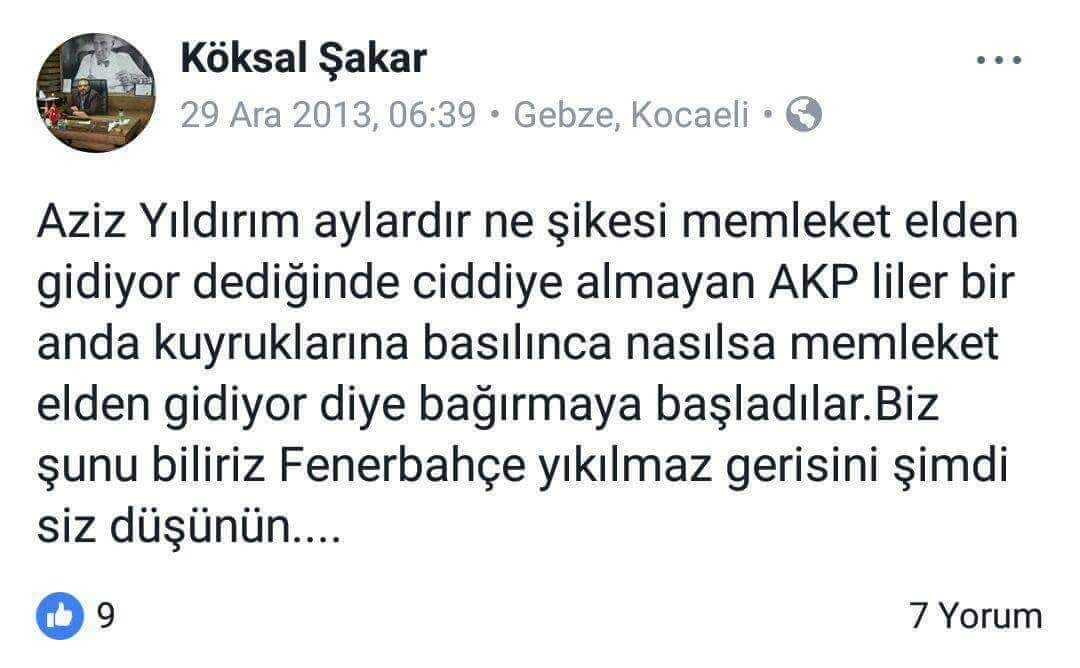 Ayrıca FETÖ'nün şike kumpasıyla ilgili olarak da, "Aziz Yıldırım aylardır ne şikesi memleket elden gidiyor dediğinde ciddiye almayan AKPliler bir anda kuyruklarına basılınca nasılsa memleket elden gidiyor diye bağırmaya başladılar. Biz şunu biliriz Fenerbahçe yıkılmaz gerisini şimdi siz düşünün..." diyerek de başka bir skandal mesaj paylaştığı görülmesi dikkat çekti.