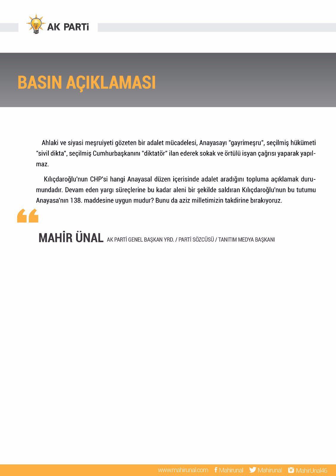 Kılıçdaroğlu'nun CHP'si hangi Anayasal düzen içerisinde adalet aradığını topluma açıklamak durumundadır. Devam eden yargı süreçlerine bu kadar aleni bir şekilde saldıran Kılıçdaroğlu'nun bu tutumu Anayasa'nın 138. maddesine uygun mudur? Bunu da aziz milletimizin takdirine bırakıyoruz."