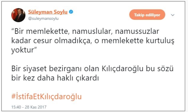 İçişleri Bakanı Süleyman Soylu, Kılıçdaroğlu'nun iddialarıyla ilgili olarak Twitter adresinden “Bir memlekette, namuslular, namussuzlar kadar cesur olmadıkça, o memlekette kurtuluş yoktur”