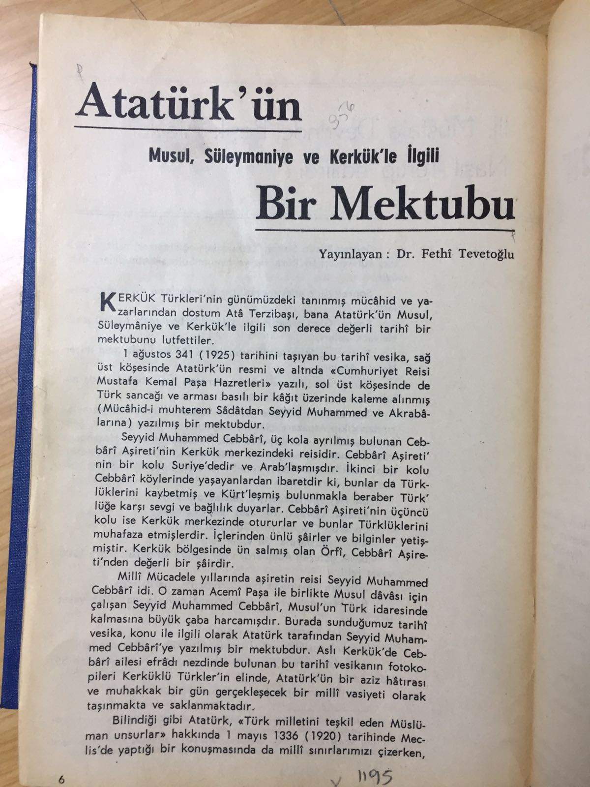 Milli Mücadele yıllarında Cebbari Aşireti, hep Türk hükümetinin yanında olmuştu. Musul’un, Kerkük’ün ve Süleymaniye’nin Türk idaresinde kalması için çok çalışmışlardı. Aslı Cebbari Aşiretinde bulunan bu mektubun fotokopileri Kerküklü Türklerin elindedir. Bu önemli mektup, ilk olarak 41 yıl önce Fethi Tevetoğlu tarafından Hayat Tarih Mecmuasında yayınlanmıştır.