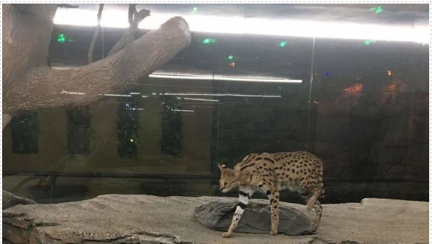 Ana vatanı Afrika olan Serval, vahşi bir kedi cinsi. Uzun bacakları ve kısa kuyruğu ile oldukça narin bir hayvan olan Serval’i evcil hayvan olarak besleyenler olsa da hayvanın doğal ortamında yaşaması gerekiyor. AVM'nin bodrum katında, cam bir kafes içerisinde sergilenen hayvanın bulunduğu ortam güneş görmüyor. Müşteriler tepkili