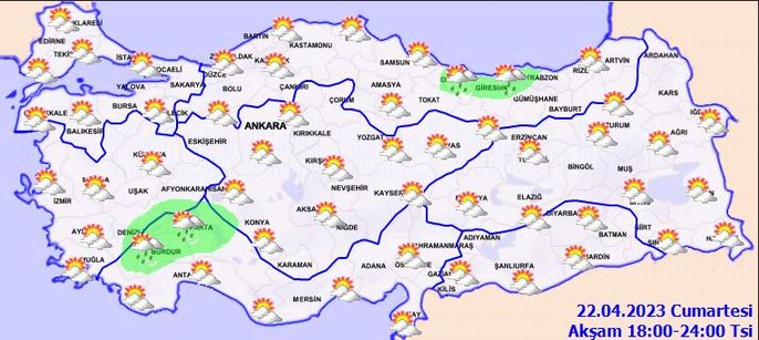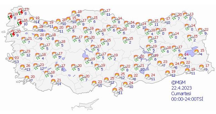 Meteoroloji Genel Müdürlüğü tarafından yapılan son değerlendirmelere göre; ülkemiz genelinin parçalı ve çok bulutlu, Marmara'nın güneyi, İç Ege, Akdeniz’in iç kesimleri, İç Anadolu, Karadeniz (Düzce ve Zonguldak dışında), Doğu Anadolu'nun kuzey ve batısı ile Kırklareli ve Edirne çevrelerinin yerel olmak üzere sağanak ve yer yer gök gürültülü sağanak yağışlı geçeceği tahmin ediliyor.