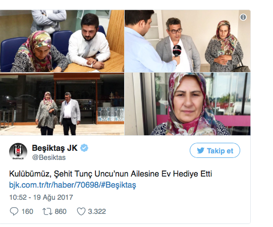 Beşiktaş Kulübü, İstanbul'da geçen yıl Beşiktaş ile Bursaspor arasında oynanan Süper Lig maçının ardından Vodafone Park yakınında gerçekleşetirilen terör saldırısında şehit olan Kartal Yuvası mağazası çalışanı Tunç Uncu'nun ailesine ev hediye etti.