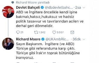 İngiltere Büyükelçisi ise Bahçeli'nin tweetine şu şekilde cevap verdi: Sayın Başkanım İngiltere ve ABD, Türkiye gibi referanduma karşı çıktı. Türkiye gibi Irak'ın toprak bütünlüğüne inanıyoruz.