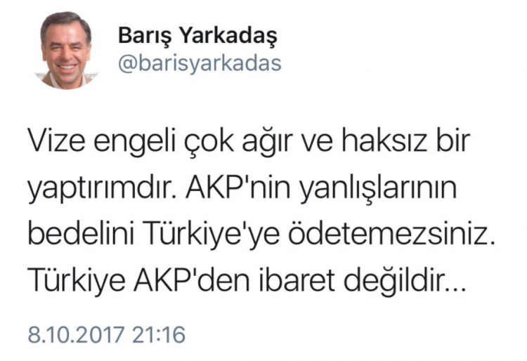 Sosyal medya hesabından yaptığı paylaşımda 'Vize engeli çok ağır ve haksız bir yaptırımdır. AKP'nin yanlışlarının bedelini Türkiye'ye ödetemezsiniz. Türkiye AKP'den ibaret değildir' dedi. Yarkadaş'a tepkiler çığ gibi büyüyor.