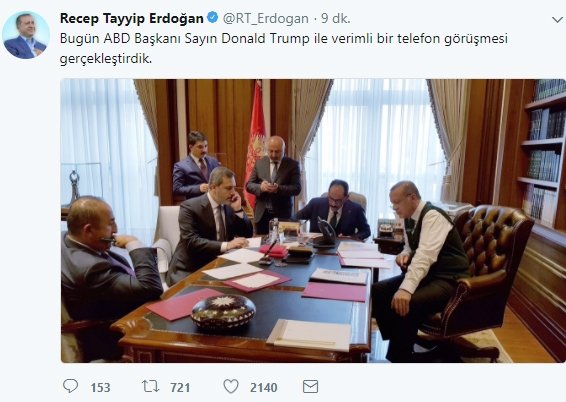 Cumhurbaşkanı Recep Tayyip Erdoğan ABD Başkanı Donald Trum ile gerçekleştirdiği görüşme sonrası bir açıklama yaptı ve görüşme anına ilişkin görselleri sosyal medyadan paylaştı. "ABD Başkanı Donald Trump ile verimli bir görüşme oldu." diyen Erdoğan bu kareyi paylaştı.