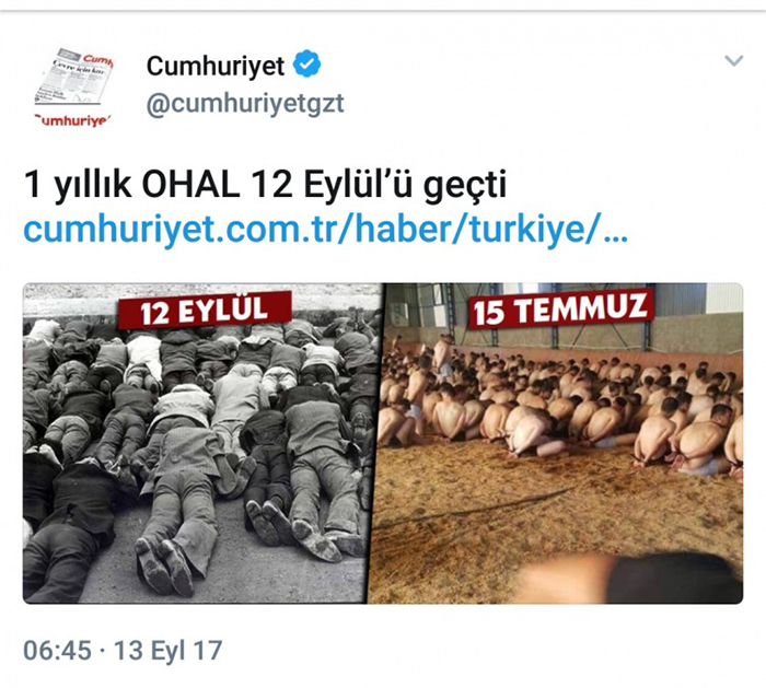1 yıllık OHAL sürecini sözde haber yaparken bu zaman aralığının 12 Eylül'ü geçtiğini söylerken kullandıkları fotoğrafla darbecilere sahip çıktılar.