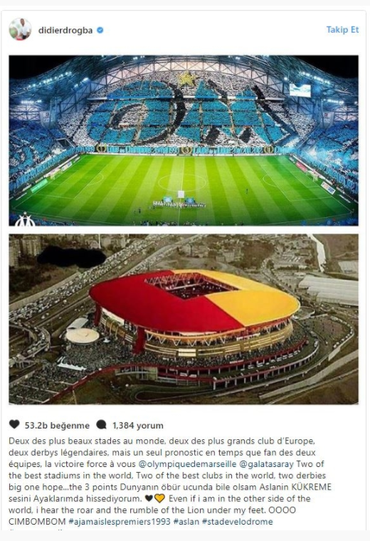 Yaklaşık iki sezon boyunca sarı kırmızılı formayı terleten Fildişili yıldız oyuncu Didier Drogba, derbiyi unutmadı. Sosyal medya hesabından eski takımına destek olan Drogba; "Dünyanın öbür ucunda bile olsam Aslanın KÜKREME sesini ayaklarımda hissediyorum" dedi.