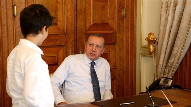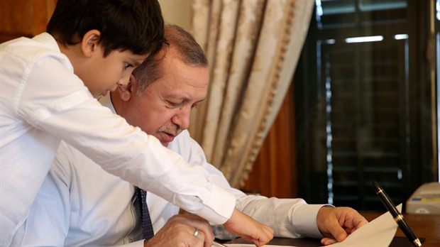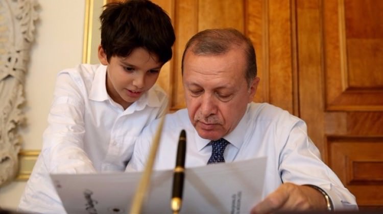 Erdoğan paylaşımında "Bugünkü mesai arkadaşım torunum Ömer Tayyip" ifadelerini kullandı.