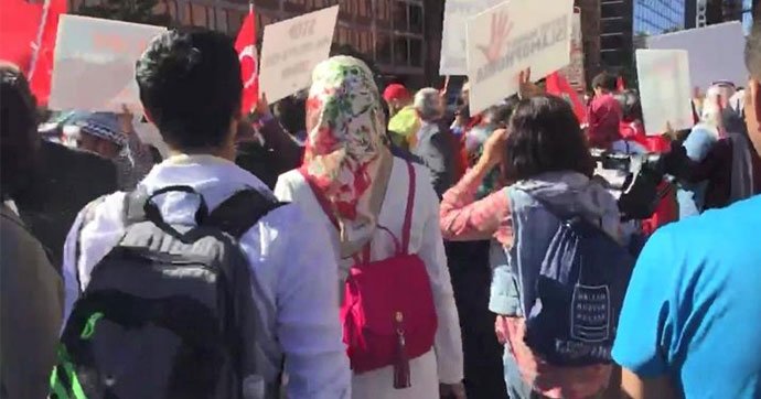 Çok sayıda kişinin ellerinde Türk bayrakları ve dövizlerle Erdoğan'a destek içinde toplandığı görülürken, pankartlarda "İslamofobiye karşı birleşme" çağrıları görüldü.