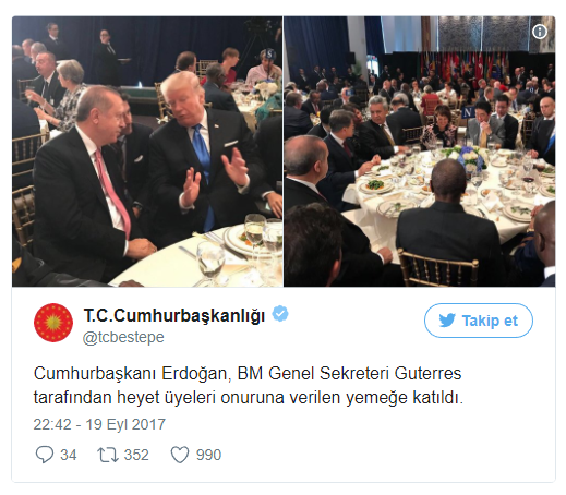 Cumhurbaşkanlığı'nın resmi Twitter hesabından paylaşılan bilgiye göre; Cumhurbaşkanı Erdoğan, BM Genel Sekreteri Guterres tarafından heyet üyeleri onuruna verilen yemeğe katıldı.