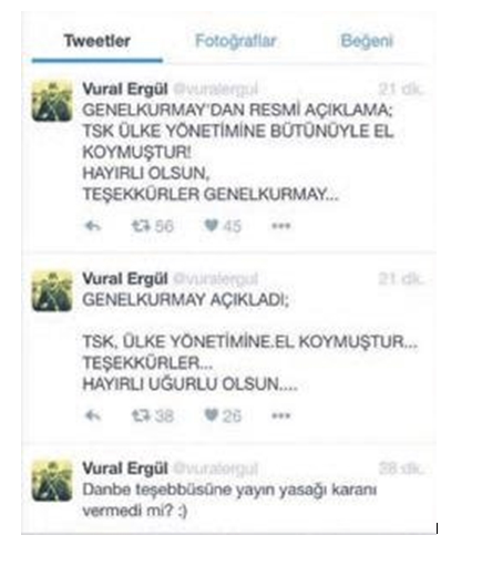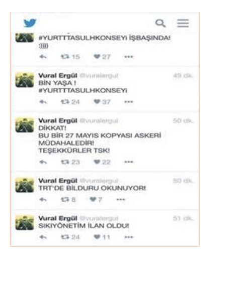 Ergül'ün 15 Temmuz gecesi Twitter'daki bazı paylaşımları şöyle: "Yurtta Sulh Konseyi nerede kaldın? Niye geç kaldın? Yurtta Sulh Konseyi işbaşında! Bin yaşa Yurtta Sulh Konseyi. Teşekkürler TSK! TSK ülke yönetimine tümüyle el koymuştur! Ergenekon kumpasına savunma tarafı olduğum günden bu yana ilk kez huzur içinde uyku uyuyacağım!"...