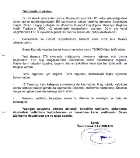 "TUSKON 5. Olağan Genel Kurulu'ndan sonra hemen istifa ettim ancak istifam kabul edilmedi. Noter aracılığıyla resmi olarak ilk istifa eden kişi benimdir. Hakkımda hediye kartı vermem ve maaşlı çalışan iki kişinin ödemelerini yapmış olmam FETÖ'ye yardım suçlaması olarak kabul edilemez. Sayın Cumhurbaşkanımızın 14 Haziran 2014'te yaptığı açıklamadan sonra Fatih Koleji'nde okuyan çocuklarımı okuldan aldım, başka bir okula kaydettim. FETÖ'yle işbirliği olan kimseyle iletişimim yoktur. 1 dolar, ByLock ve Rızanur Meral ile bir ilişkim yoktur. Örgütün eğitim okullarında okumadım. Zaman Gazetesi'ne aboneliğim yoktur. 2014 yerel seçimlerinde AK Parti'yi destekledim. Seçimlerde AK Parti’nin resimlerini duvara kaplattırdım. Devlet büyüğüne hakaret eden Rızanur Meral'i tek alkışlamayan bendim. Yurt dışında çok sayıda mağazam olmasına rağmen yurt dışına gitmedim. 15 Temmuz hain darbe girişiminden sonra da yurt dışına gitmedim. Mayıs ayında tahliye oldum, yine gitmedim. 13 aydır tutukluluyum. 4 bin 200 çalışanı olan 500 mağazası olan bir şirketin ortağıyım. 2 çalışana ödenen maaşla şirketlere el konulması izah edilemez. Öncelikle tutuksuz yargılanmamı, sonrasında şirketlerimdeki kayyum kararlarının kaldırılmasını istiyorum."