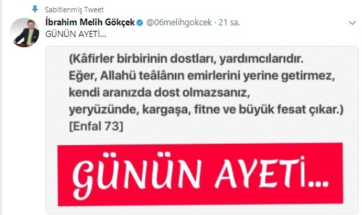 İşin sırrı biraz da Gökçek’in twitter mesajlarında ki değişim de saklı... Peki bayram değil seyran değilken Melih Gökçek neden birden Kuran-ı Kerim referanslı birliktelik mesajlarının yanına merhum Necmettin Erbakan’ın “Saddam gidecek Kürt devleti kurulacak” açıklamalarını da eklemesinin hedefi ya da amacı kafa karıştırdı. Kimilerine göre bu mesajların tek muhattabı var o da Cumhurbaşkanı Erdoğan.