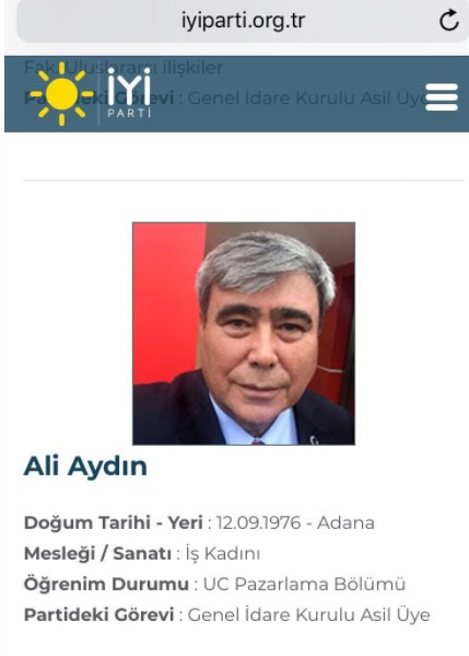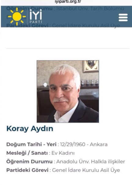 İYİ Parti’nin Teşkilatlardan sorumlu Genel Başkan Yardımcısı Koray Aydın’ın doğum yeri ve tarihi ilk açılan sitede yanlış yazıldı. Mesleği ev kadını olarak gösterilen Koray Aydın’ın okulu da Anadolu Üniversitesi Halkla İlişkiler Bölümü olarak gösterildi.