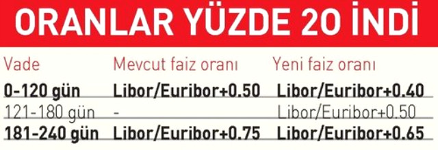 Hükümet, ihracatçının maliyetlerini düşürmek için önemli bir adım daha attı. Eximbank, reeskont döviz kredisi faiz oranlarını 10 baz puan indirdi. Türk imalat sanayisinde önemli rolü olan, toplam ihracatın yarısından fazlasını gerçekleştirmesine rağmen uygun maliyetli krediye ulaşamayan KOBİ'ler için de musluğu açtı. KOBİ'lere 2.5 milyar TL'lik destek sağlanacak.
