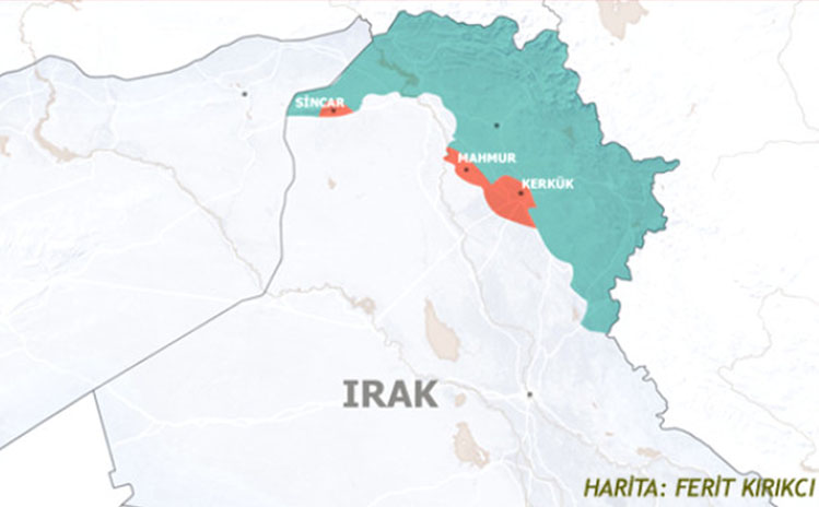 Irak'ın kuzeyinde Kerkük, Sincar ve Mahmur'un kontrolünün Bağdat yönetimine geçmesiyle, mevcut harita da değişti. Yeni haritada IKBY'nin kaybettiği noktalar görülüyor.