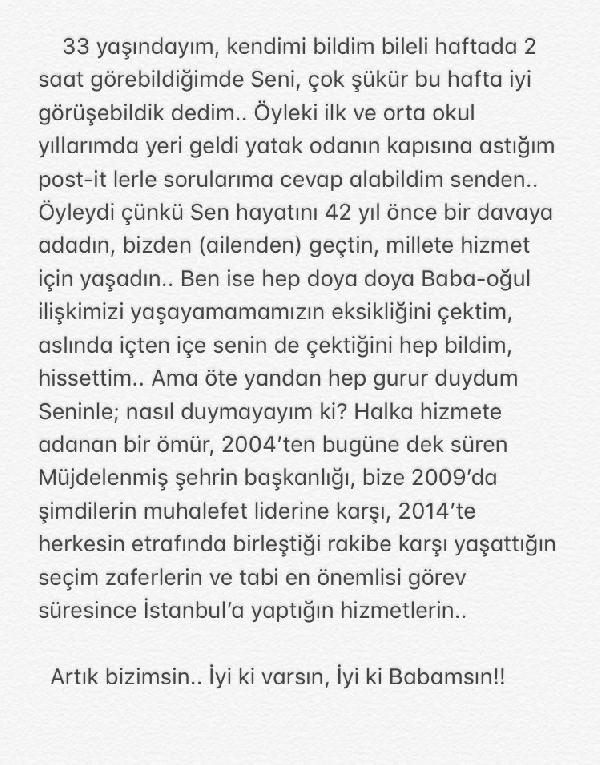 Attığı mesajında 33 yaşında olduğunu belirten Mustfa Ömer Topbaş, "33 yaşındayım, kendimi bildim bileli haftada 2 saat görebildiğimde seni, 'çok şükür bu hafta iyi görüşebildik' dedim... Öyle ki; ilk ve ortaokul yıllarımda yeri geldi yatak odanın kapısına astığım post-itlerle sorularıma cevap alabildim senden. Öyleydi çünkü, sen hayatını 42 yıl önce bir davaya adadın, bizden(ailenden) geçtin, millete hizmet için yaşadın. Ben ise hep doya doya baba-oğul ilişkimizi yaşayamamamızın eksikliğini çektim, aslında içten içe senin de çektiğini hep bildim, hissettim. Ama öte yandan hep gurur duydum seninle, nasıl duymayayım ki? Halka hizmete adanan bir ömür, 2004'ten bugüne dek süren müjdelenmiş şehrin başkanlığı, bize 2014'te herkesin etrafında birleştiği rakibe karşı yaşattığın seçim zaferin ve tabi en önemlisi görev süresince İstanbul'a yaptığın hizmetlerin. Artık bizimsin. İyi ki varsın, iyi ki babamsın." ifadelerini kullandı.