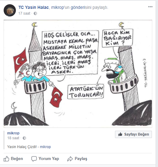 Sosyal medyada yayılan Yasin Halac imzalı karikatürde açık bir şekilde Türk Silahlı Kuvvetleri içinde bulunan Kemalist askerlere darbe çağrısı yapıldığı görülüyor. Karikatür içerisinde yer alan minarelerin bir tanesinde öğrenciler," Hoş gelişler ola...Mustafa Kemal Paşa. Askerinle milletin bayrağınla çok yaşa. Marş marş ileri ileri marş ileri Türk'ün askeri..." ifadelerine karşılık olarak diğer minarede ise kötü bir şekilde karikatüze edilmiş bir imam telefonla konuşarak "Hocam kim bağırıyor kim?" sorusuna, Kemalist askerlere gönderme yapılarak, "Atatürk'ün torunları! cevabını veriyor.
