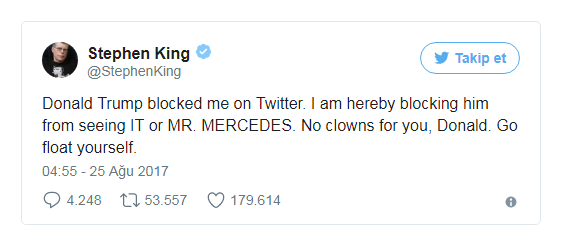 Ünlü yazar Stephen King, kendisini Twitter'dan engelleyen ABD Başkanı Donald Trump'a misilleme olarak, yakında vizyona girecek olan filmi IT ile Mr. Mercedes adlı dizisini izlemesini ‘yasakladı'.