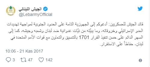 Lübnan Ordusu'nun Twitter hesabından yayınladığı açıklamaya göre, Lübnan Ordu Komutanı, güney sınırında "İsrailli düşmanının tehdit ve ihlalleri "ile yüzleşmek için" tam hazır" olma çağrısında bulundu.