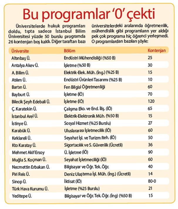 Devlet üniversitelerinde lisans programlarında 373 bin 642 kontenjan vardı, 26 bin 967’si yani yüzde 7.2’si; ön lisansta da 346 bin 68 kontenjanın 127 bin 682’si yani yüzde 36.8’i boş kaldı. Devletlerde boş kontenjan oranı yüzde 21,4 gerçekleşirken, vakıf üniversitelerinin toplam kontenjanının yüzde 29,1’i boş kaldı. Burada da en büyük fire ön lisans programlarında yaşandı. Ön lisansta 85 bin 295 kontenjanın 33 bin 185’i boş kalırken, 83 bin 536 lisans programının 16 bin 40’ı dolmadı. KKTC’deki üniversitelerde boş kontenjan oranı yüzde 46.9’a ulaşırken, yurt dışındaki diğer üniversitelerin yüzde 56.6’sı dolmadı. KKTC üniversitelerinde lisansta 6 bin 836, ön lisansta da 2 bin 700 boş kontenjan bulunuyor. Ek yerleştirme döneminde bu kontenjanlardan, merkezi yerleştirme döneminde tercih yapmayanlar ile tercih yapıp da hiçbir programa yerleşemeyenler yararlanabilecek.