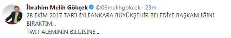 “İşte istifa konuşmam” tweet’iyle istifa açıklamasının videosunu paylaşan Gökçek, ikinci paylaşımında ise ise “28 Ekim 2017 tarihiyle Ankara Büyükşehir Belediye Başkanlığı’nı bıraktım. Twit aleminin bilgisine” yazdı.