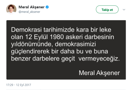 37 yıl önce 12 Eylül'de Kenan Evren ve arkadaşları tarafından demokrasiye vurulan büyük darbe için sosyal medya üzerinden paylaşımda bulunan Meral Akşener, "Demokrasi tarihimizde karanlık bir leke olan 12 Eylül 1980 askeri darbesi yıldönümünde, demokrasimizi güçlendirerek bir daha bu ve buna benzer darbelere geçit vermeyeceğiz" mesajını paylaştı.