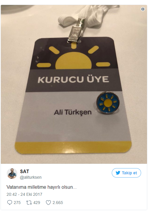 Eski SAT komandosu Ali Türkşen, Twitter hesabından, yarın kurulması planlanan Meral Akşener'in partisine ait olduğu düşünülen parti kartını paylaştı.Paylaşılan kartın üzerinde, etrafında sekiz çizgi bulunan güneş şeklindeki parti logosu dikkat çekti. Türkşen yaptığı paylaşımda "Vatanıma milletime hayırlı olsun" dedi.
