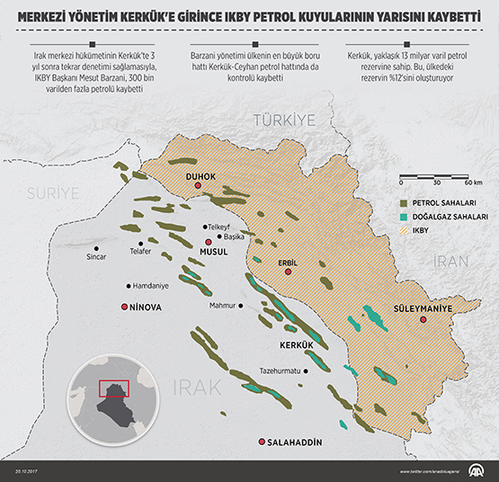 Irak merkezi hükümetinin, Kerkük'te 3 yıl sonra tekrar denetimi sağlamasıyla, Irak Kürt Bölgesel Yönetimi (IKBY) Başkanı Mesut Barzani'nin, Peşmergeler tarafından burada denetlenen günlük 300 bin varilden fazla petrolü kaybettiği belirtiliyor.