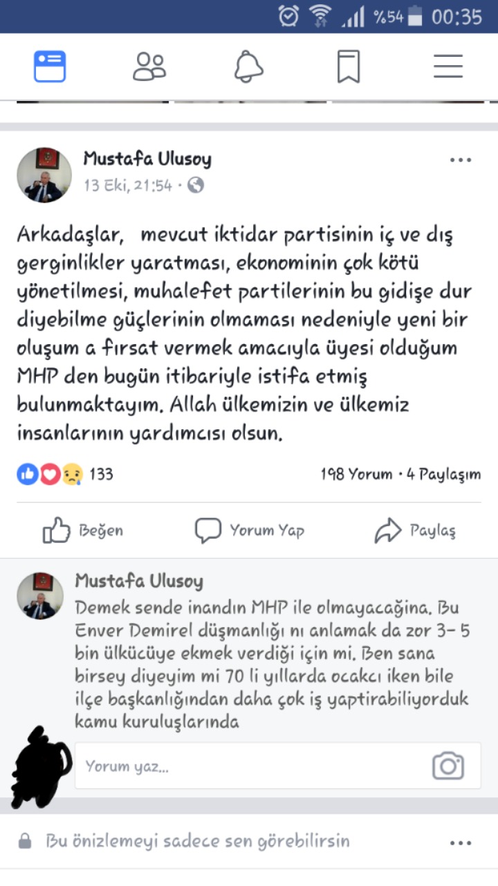Sosyal medya hesabından istifa ettiğini açıklayan MHP Etimesgut İlçe başkanı Mustafa Ulusoy, "Arkadaşlar, mevcut iktidar partisinin iç ve dış gerginlikler yaratması, ekonominin çok kötü yönetilmesi, muhalefet partilerinin bu gidişe dur diyebilme güçlerinin olmaması nedeniyle yeni bir oluşum a fırsat vermek amacıyla üyesi olduğum MHP den bugün itibariyle istifa etmiş bulunmaktayım. Allah ülkemizin ve ülkemiz insanlarının yardımcısı olsun." açıklamasında bulundu.