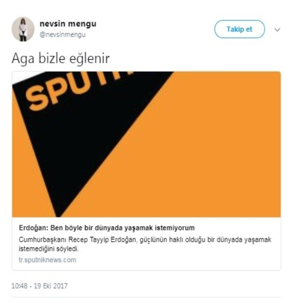 Haberi alıntılayarak paylaşan Mengü tweetine, "Aga bizle eğlenir" şeklinde not düştü.