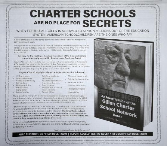 FETÖ'nün ABD'deki sözleşmeli okullarıyla ilgili "Aldatma İmparatorluğu: Gülen Sözleşmeli Okul Ağı Üzerine Bir Araştırma" adlı kitabı kaleme alan Amsterdam, Amerikan New York Times gazetesine ilan verdi.