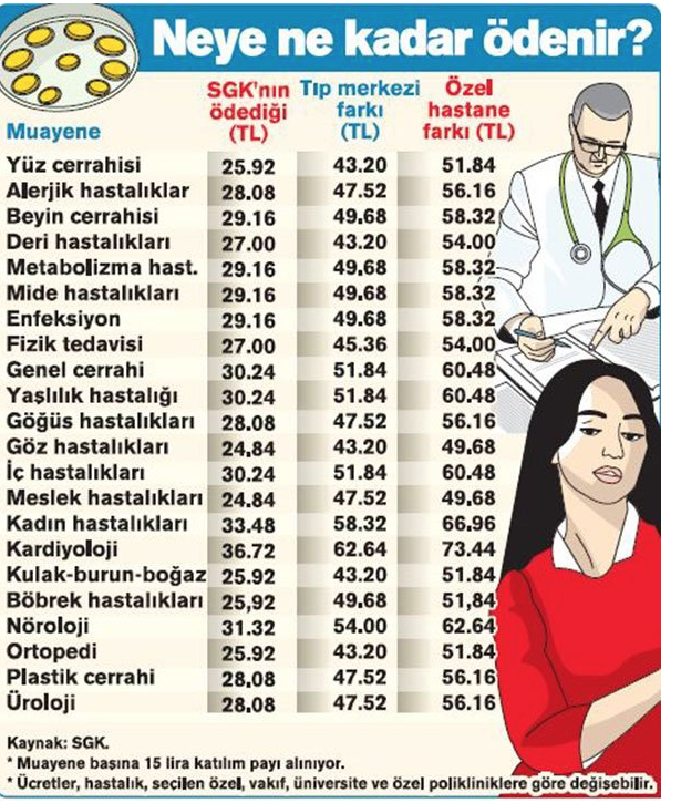 Bir örnek vermek gerekirse; kadın hastalıkları nedeniyle özel hastaneye giden bir hasta için SGK 33.48 lira ödeme yapıyor. Hastane, bunun üstüne 66.96 liraya kadar ilave ücret talep edebiliyor. 15 lira katılım payı ise sabit ve muayene başına alınıyor. Bazı özel hastanelerin olması gerekenden fazla ücret aldığıyla ilgili çok fazla şikayetler duyuluyor.