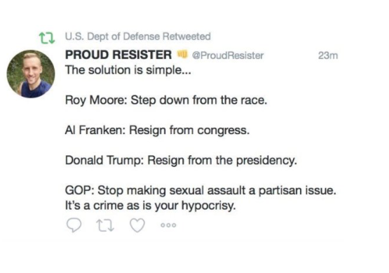 Washington'u çalkalayan taciz iddiaları üzerine söz konusu Twitter kullanıcısı "Çözüm belli… Roy Moore, yarıştan çekil. Al Franken, Kongre'den istifa et. Donald Trump başkanlıktan istifa et. Cumhuriyetçi Parti, cinsel tacizleri parti konusu yapmayı bırak. İkiyüzlülüğünüz gibi bu da bir suçtur." paylaşımında bulunmuştu.