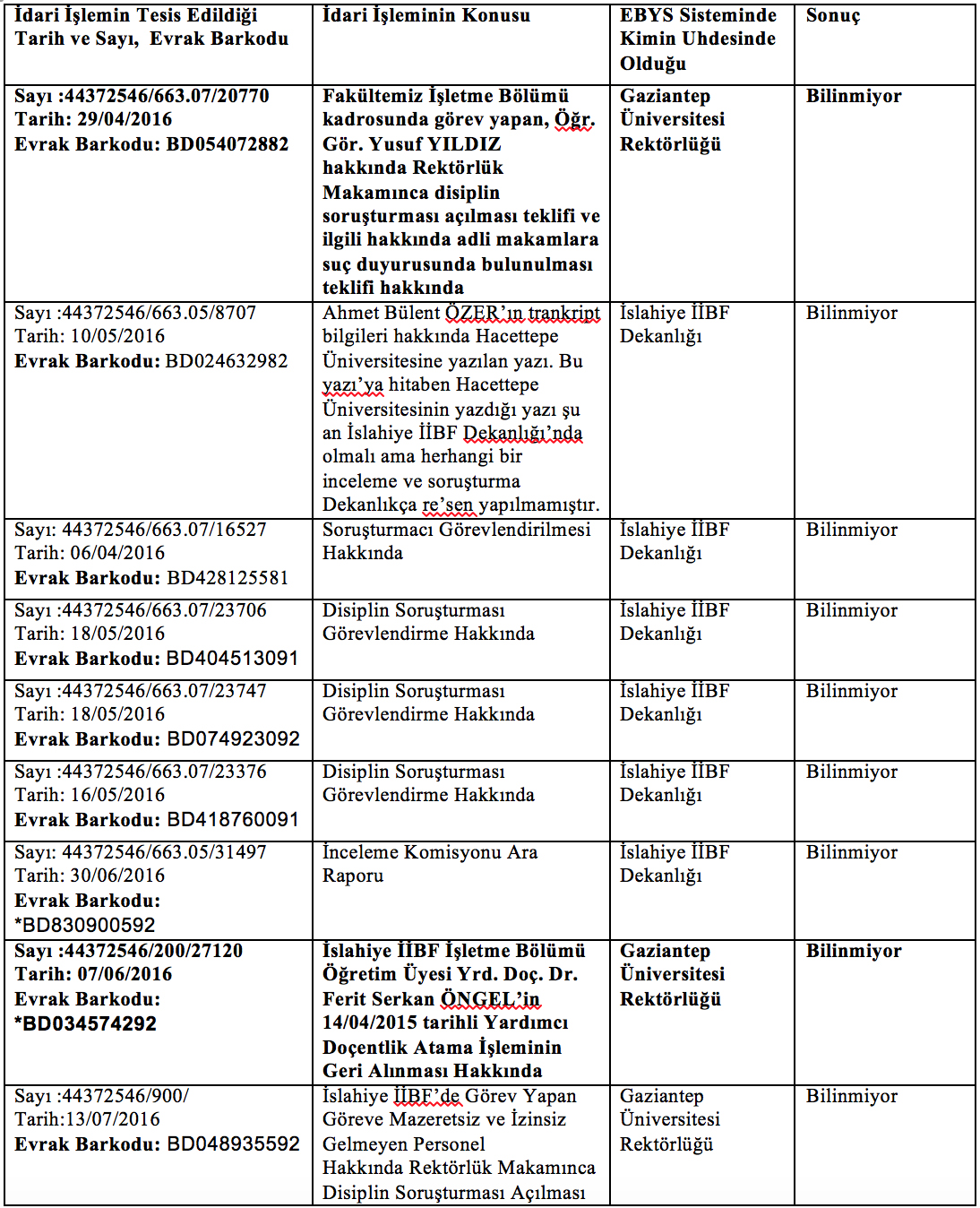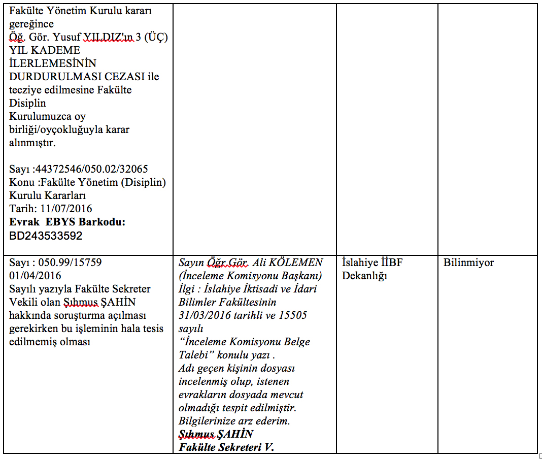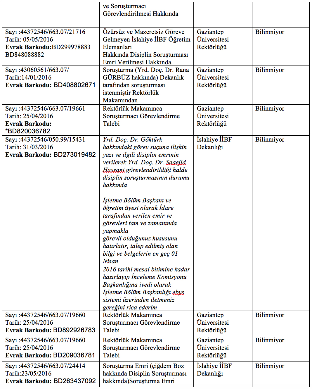 Öte yandan AVAZTÜRK, şu an görev yapan İslahiye İİBF Dekanlığı ve Gaziantep Rektörlüğü tarafından devam ettirildiği ve devam ettirilmediğine ilişkin çeşitli konulardaki İNCELEME, SORUŞTURMA emirlerinin kayıtlarına ulaştı.