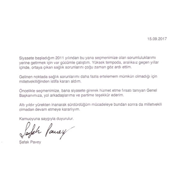 CHP İstanbul Milletvekili Şafak Pavey milletvekilliğinden istifa etti. Şafak Pavey yaptığı basın açıklamasında istifasına gerekçe olarak sağlık sorunlarını gösterdi