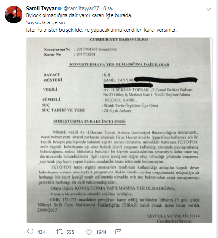 Üyelerinin yarısı FETÖ'cü çıkan YARSAV’ın kurucu eski başkanı hukukçu Ömer Faruk Eminağaoğlu'nun yayınladığı "Bylock kullanan AK Parti'lilerin tam listesi"ne ağır sözlerle karşılık veren Şamil Tayyar bugün yargı kararının bulunduğu belgeyi yayınlayarak,"Bylock olmadığına dair yargı kararı işte burada.Soysuzlara gelsin.İster rulo ister bu şekilde, ne yapacaklarına kendileri karar versinler." dedi.