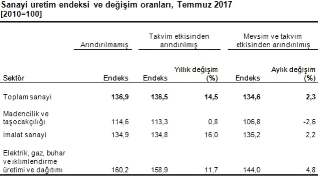 Takvim etkisinden arındırılmış sanayinin alt sektörleri (2010=100 temel yıllı) incelendiğinde, 2017 yılı Temmuz ayında madencilik ve taşocakçılığı sektörü endeksi bir önceki yılın aynı ayına göre yüzde 0,8, imalat sanayi sektörü endeksi yüzde 16 ve elektrik, gaz, buhar ve iklimlendirme üretimi ve dağıtımı sektörü endeksi yüzde 11,7 arttı.