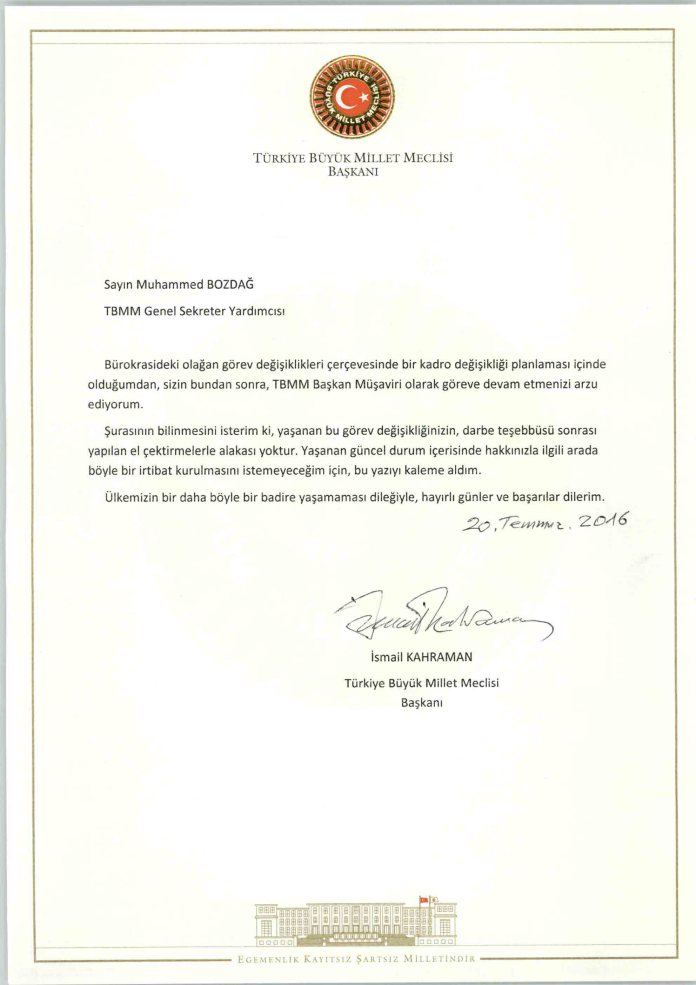 TBMM'de uzun yıllar genel sekreter yardımcısı olarak görev yapan Muhammed Bozdağ'da son KHK ile meslekten ihraç edildi. Görevden alındıktan sonra TBMM Başkanı İsmail Kahraman'dan aldığı, "FETÖ’cü değilsin" yazısı da ihraçtan kurtaramadı.