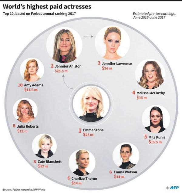 İlk 10'da yer alan diğer kadın oyuncular ise şöyle: Melissa McCarthy, Mila Kunis, Emma Watson, Charlize Theron, Cate Blanchett, Julia Roberts ve Amy Adams.