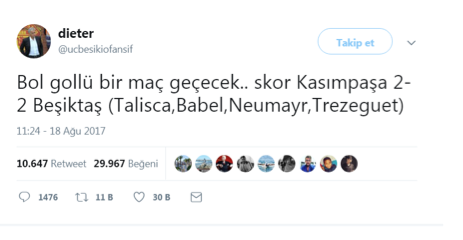 Benzerine ender rastlanır biçimde karşılaşma öncesi "Bol gollü bir maç geçecek.. skor Kasımpaşa 2-2 Beşiktaş (Talisca,Babel,Neumayr,Trezeguet)" tahmininde tam isabet sağlayan kullanıcı, herkesi şaşkına çevirirken, sosyal medyada beğeni rekoru kırdı.