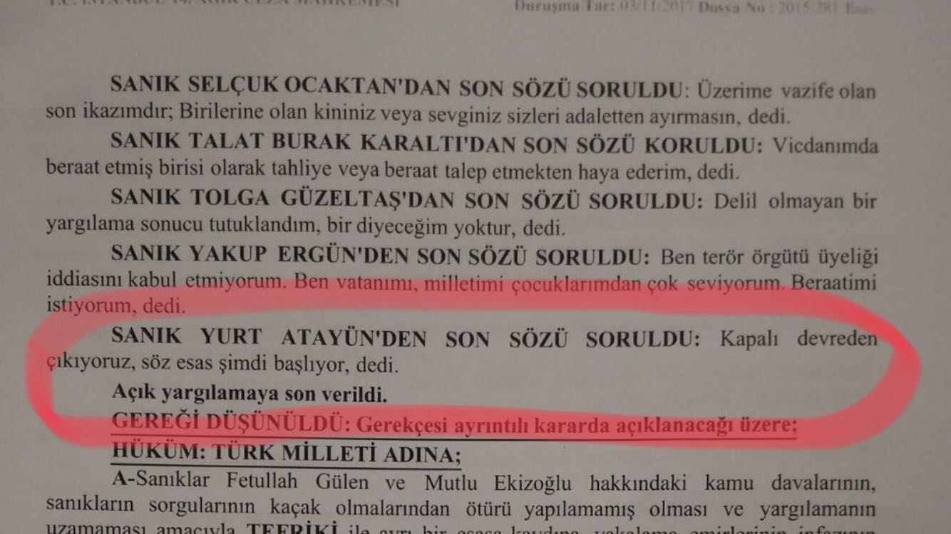 Eski Emniyet Müdürü Sanık Yurt Atayün ise ''Kapalı devreden çıkıyoruz, söz şimdi başlıyor." ifadelerini kullandı.