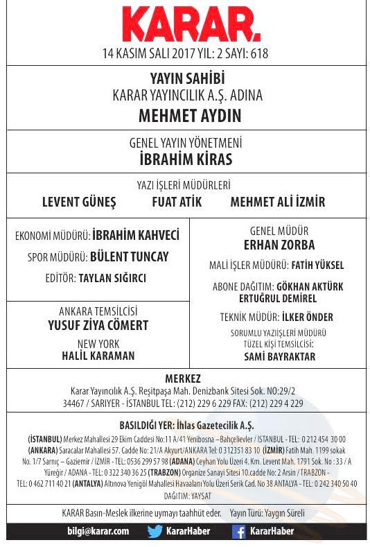 Karar gazetesinin künyesinde, gazetenin adresi olarak “Reşitpaşa Mah. Denizbank Sitesi Sok. No: 29 Sarıyer – İstanbul” gösteriliyor.