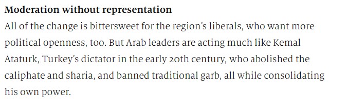 Yazının önemli bir noktasında ise Atatük’ü diktatör olarak nitelendirerek bölgede bulunan bazı Arap liderlerinin de şeriatı ve saltanatı kaldırarak eski kıyafetleri yasaklayan Atatürk gibi davrandıkları vurgulanıyor.