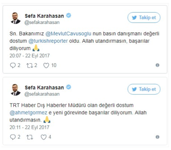 Karahasan, Dışişleri Bakanı Çavuşoğlu'nun yeni basın danışmanın TRT New York muhabiri Kahraman Halisçelik olduğunu duyurdu.