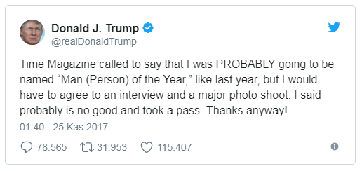 Tartışma, Trump’ın Twitter hesabından şu mesajı atmasıyla başladı: “Time dergisi MUHTEMELEN ‘Yılın Adamı (Kişisi)’ seçildiğimi söylemek için aradı. Fakat bir söyleşi vermeyi ve büyük bir fotoğraf çekimi yapmayı kabul etmem gerekiyormuş. Ben de ‘muhtemelen’in işe yaramayacağını söyledim ve reddettim. Yine de teşekkür ederim.”