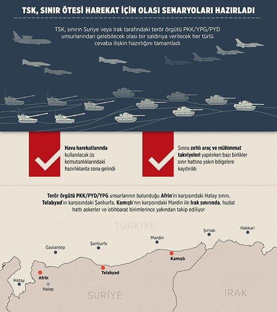 Güvenlik kaynaklarından edinilen bilgiye göre, sınırın Suriye veya Irak tarafındaki terör örgütü PKK/YPG/PYD unsurlarından gelebilecek olası bir saldırıya verilecek her türlü cevaba ilişkin hazırlıklar tamamlandı.